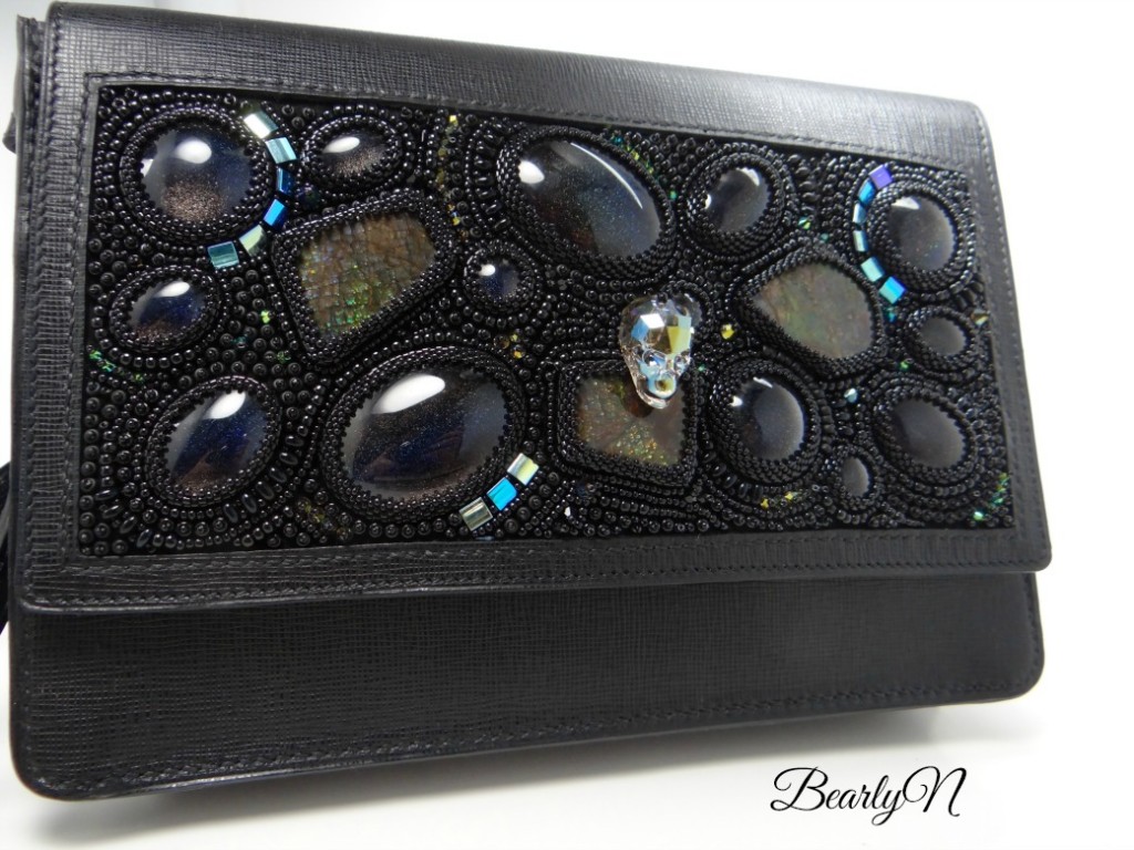 Ceux qui me connaissent savent à quel point je suis ….exigeante… sur la qualité des accessoires. Bijoux, chaussures… et sacs. Parce que ce sont ces éléments qui vont décaler une tenue, lui donner tout son style et son caractère. Et un beau jour que je me promenais dans un salon d’artisans d’art, j’ai rencontré une maroquinière pour laquelle la qualité du travail semblait aussi importante. Julie Troncin vient d’une grande maison, On échange, on se donne rendez-vous, la perspective de pouvoir mêler nos deux techniques nous intéresse, j’ai très envie d’une pochette du soir. On veut du rock. Du glam, un peu. Et puis du sombre, des teintes changeantes. On cogite sur le modèle, sur la technicité d’intégrer une broderie perlée… Quelques heures (….) plus tard, nous sommes d’accord, une pochette rectangulaire, des formes épurées pour équilibrer le chaos de la broderie.  Je m’occupe de la partie brodée, où se mêlent ammolites, skull en cristal de Swarovski, cabochon de verre teintés de noir holographique et perles de verre, tandis que Julie s’attelle au travail de maroquinerie, couture et finitions main.