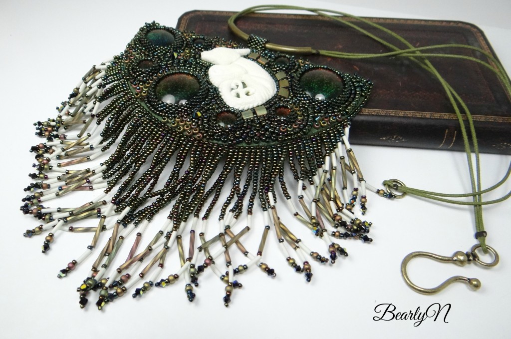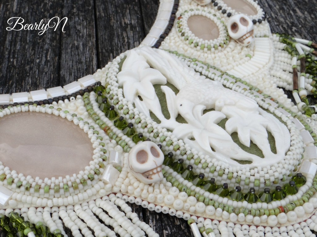 Au premier abord, le plastron Welcome To The Jungle est un collier tout en douceur, avec ses tendres teintes d’ivoire et de jeunes pousses. Un colibri se désaltère du nectar de fleurs au parfum capiteux (cabochon en os sculpté à la main), mais je vous suggère de faire attention où vous mettez les pieds!
