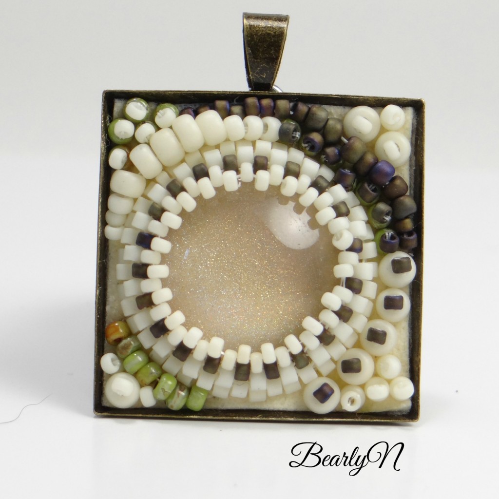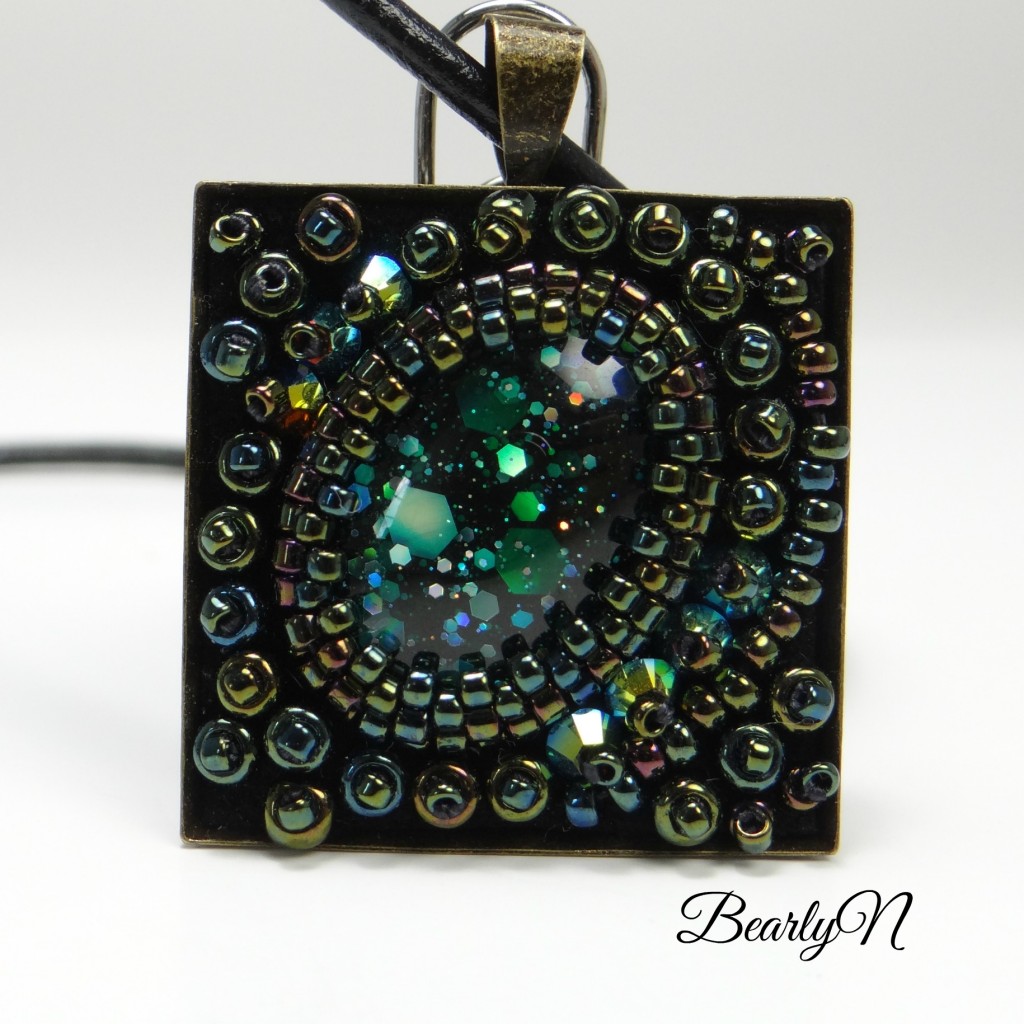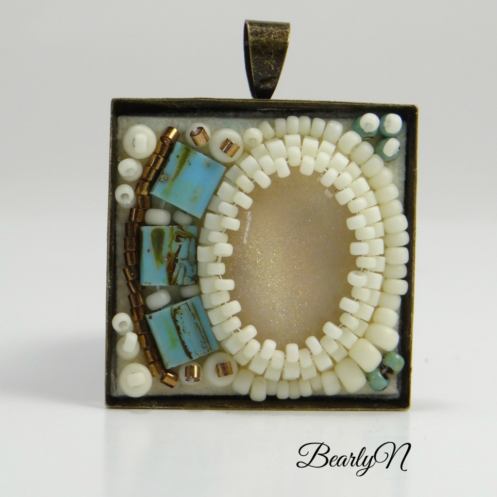 Je me suis beaucoup amusée avec la réalisation de ce pendentif demi-lune mettant en scène un chameleon en os sculpté. Je pense avoir chanté ce vieux titre de Culture Club tout le temps de la broderie…et comme le dit la chanson, les cabochons se teintes de rouges, d’or et de vert….