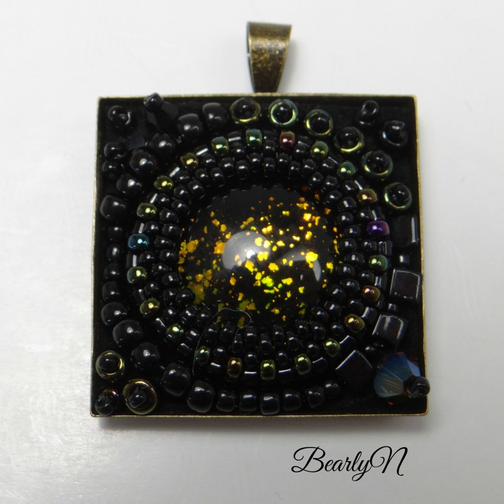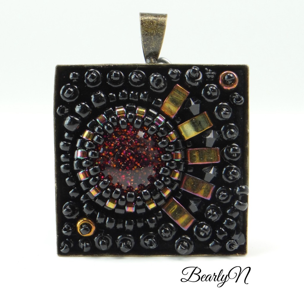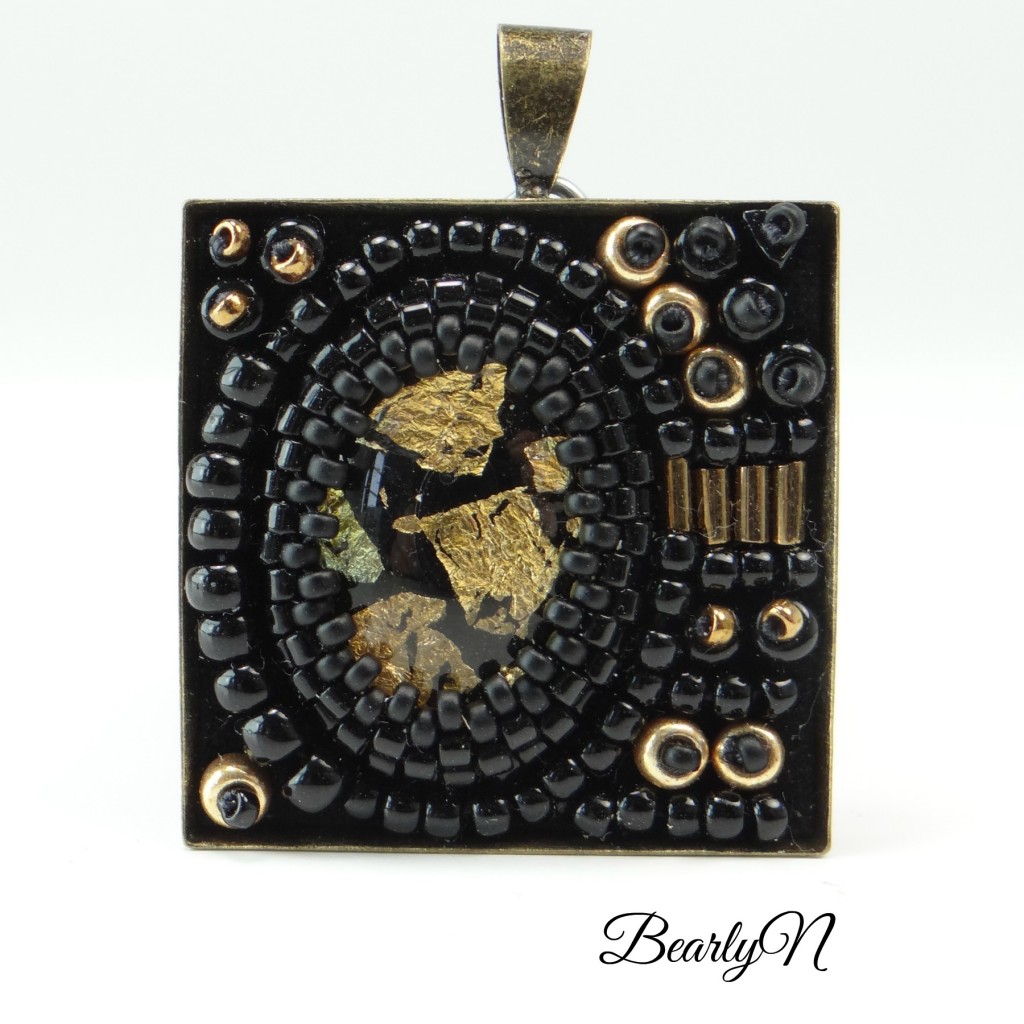 Je me suis beaucoup amusée avec la réalisation de ce pendentif demi-lune mettant en scène un chameleon en os sculpté. Je pense avoir chanté ce vieux titre de Culture Club tout le temps de la broderie…et comme le dit la chanson, les cabochons se teintes de rouges, d’or et de vert….