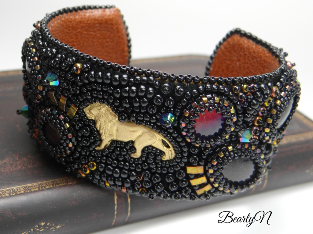 Dans ma jungle, terrible jungle, le lion ne meurt pas ce soir, il s’endort tranquillement…. Une broderie noire agrementée d’or cuivré et de cabochons aux teintes changeantes, pourpres orangées.