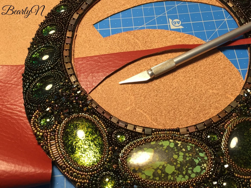 Lorsque je sélectionne mes cuirs, je prends en considération deux points importants; la provenance et l’épaisseur. Mes bijoux pouvant être en contact avec la peau, je ne prends que des cuirs français. Pour ce plastron, j’ai opté pour un tannage végétal; sans métaux lourds et sans risque d’allergie. L’autre critère est l’épaisseur; je ne prends que des cuirs d’une épaisseur inférieure à 1 mm, tout d’abord parce que je couds à la main et ensuite parce que la bordure de perles doit cacher la tranche du cuir.