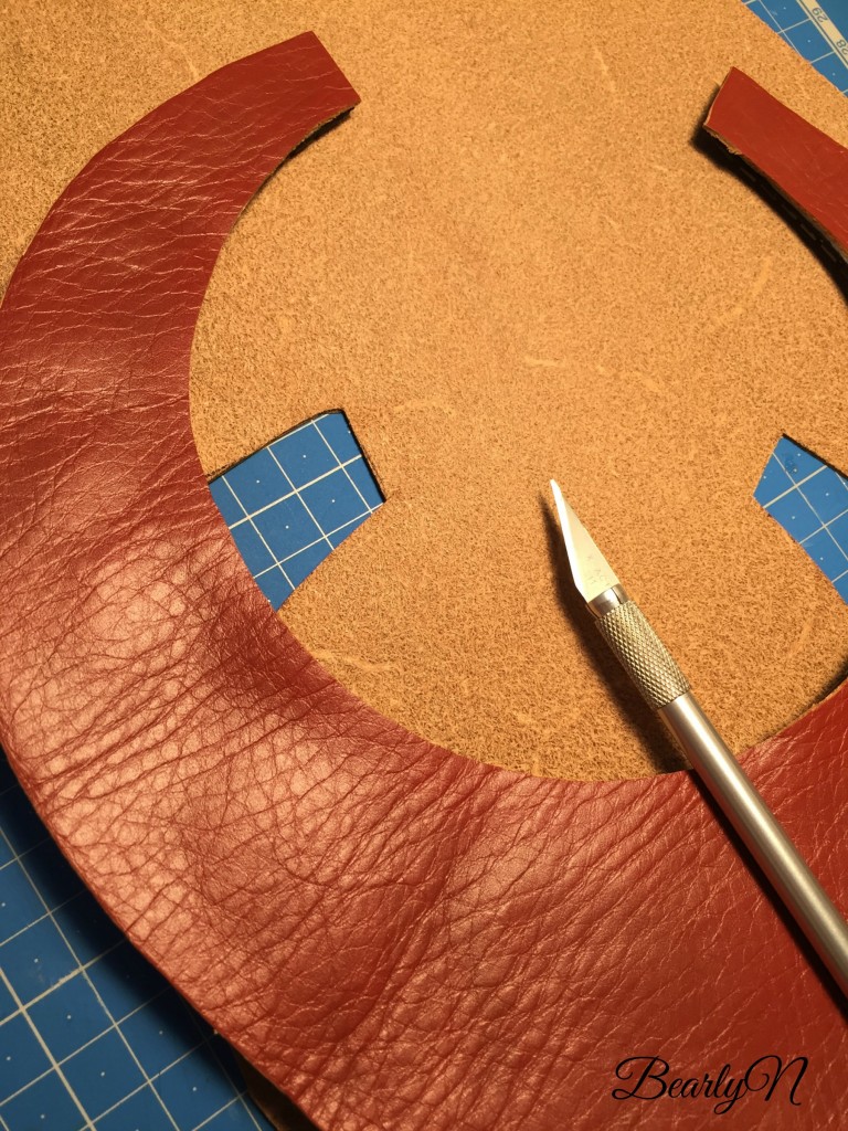 Pour ce plastron, j’ai donc utilisé un cuir d’1 mm d’épaisseur, de teinte marron brique. Malgré son épaisseur, il est souple et relativement facile à percer