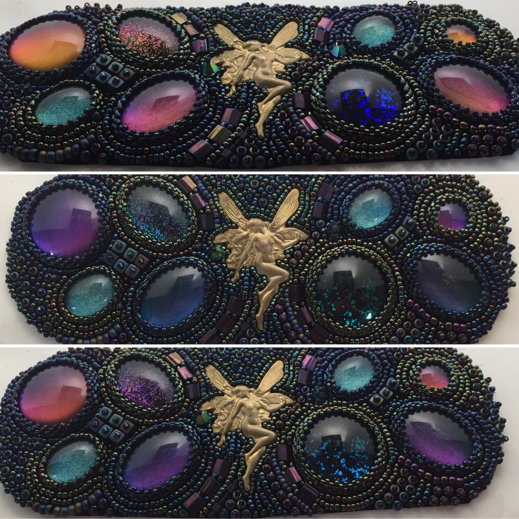 Une jolie fée en laiton est le point focal de cette manchette. Pour teinter les cabochons, j’ai principalement utilisé des vernis duochromes, c’est-à-dire qu’ils changent de couleur selon leur inclinaison, comme on peut le voir ci-dessous (broderie avant montage sur la manchette)