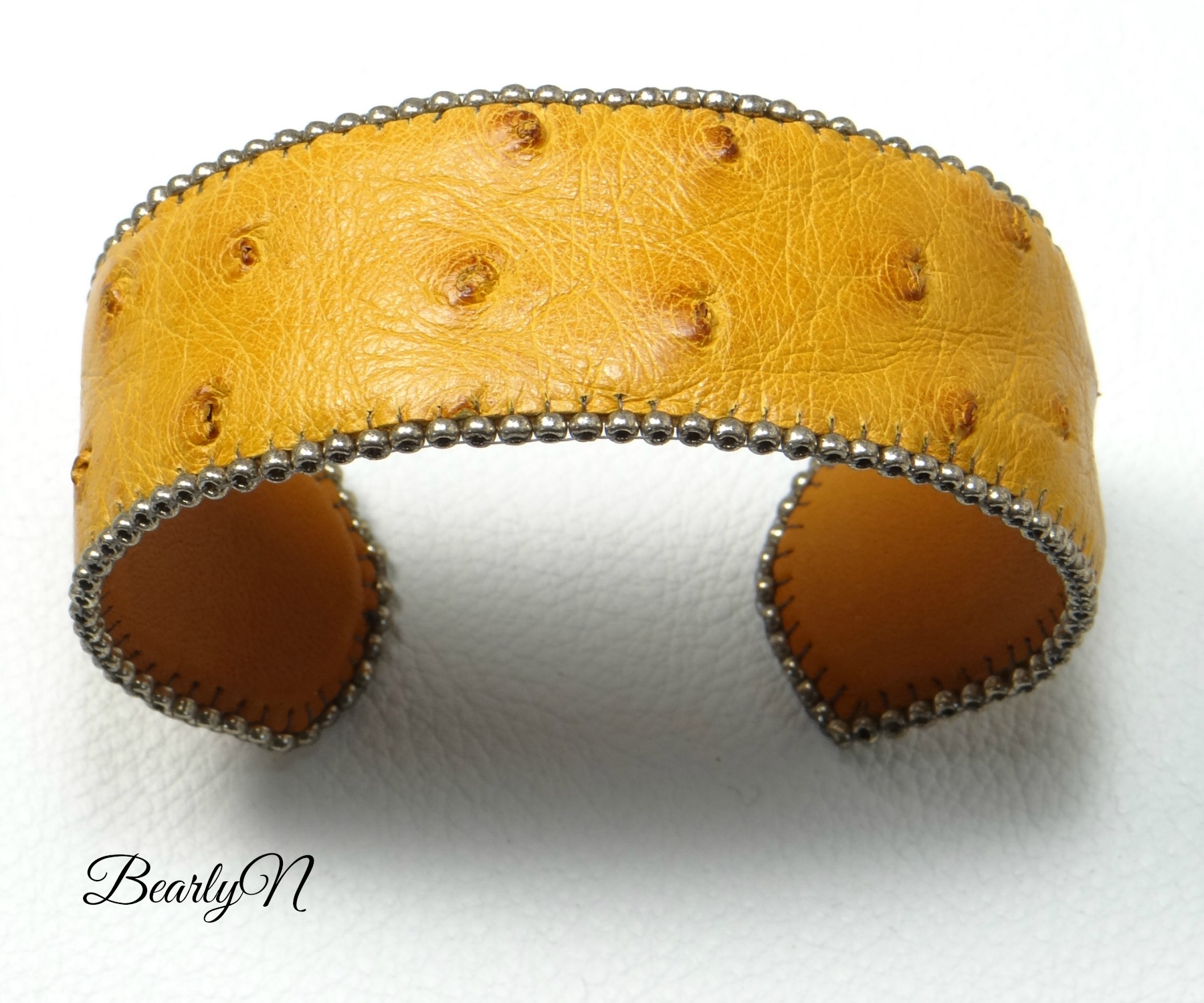 Elégant bracelet en cuir d’autruche de teinte fauve, doublé de cuir de veau au tannage végétal, pour un contact sans danger avec la peau. Les cuirs sont posés sur une manchette en laiton, ajustable à toute taille de poignet par légère pression. Les tranches sont brodées d’une rangée de perles galvanisées , pour une finition soignée et raffinée.